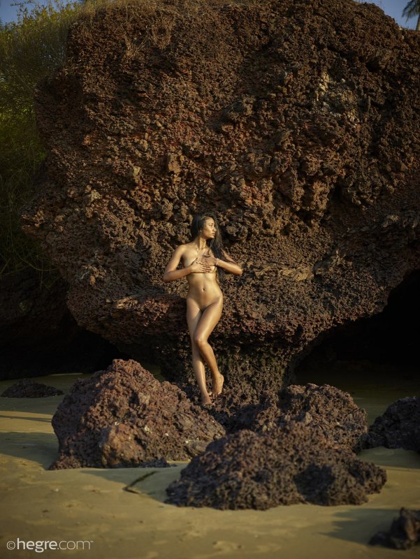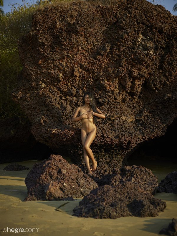 Расположившись рядом со скалами на пляже, смуглая и полностью голая девушка с влажными длинными волосами начинает красиво позировать и грациозно прогибаться. Наслаждаясь происходящим, молоденькая стройняшка подробно показала натуральные сиськи с немного набрякшими сосочками и бритую письку с попочкой, в процессе стараясь ставить руки на талию.