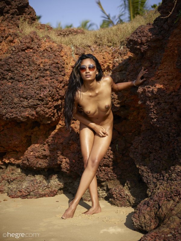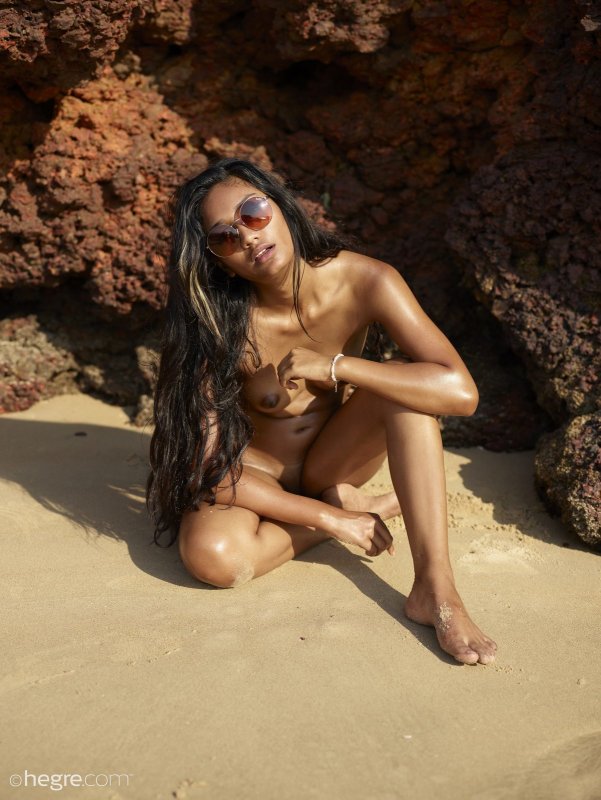 Выбрав самое укромное и тихое место на пляже, смуглая девица в очках начинает эротично позировать и показывать сексуальное голое тело с натуральными сиськами и возбужденными сосочками. А в тот момент когда стройная девушка улеглась на песок, она сразу же раздвинула промежность и засветила бритую письку с немного грязными половыми губками.