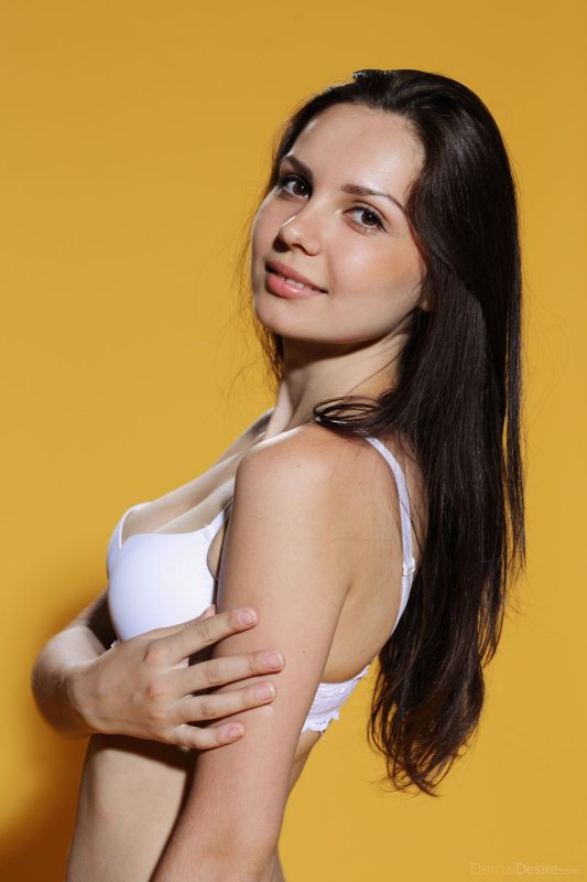 Привлекательная модель с упругой маленькой грудью и возбужденными торчащими сосками, медленно скинув с себя трусики и лифчик, эротично позирует в студии. Мило улыбаясь, стройняшка так же подробно засвечивает бритую письку с гладким лобком, а поворачиваясь спиной демонстрирует задницу. В будущем молодая девушка так же присаживалась на стул.