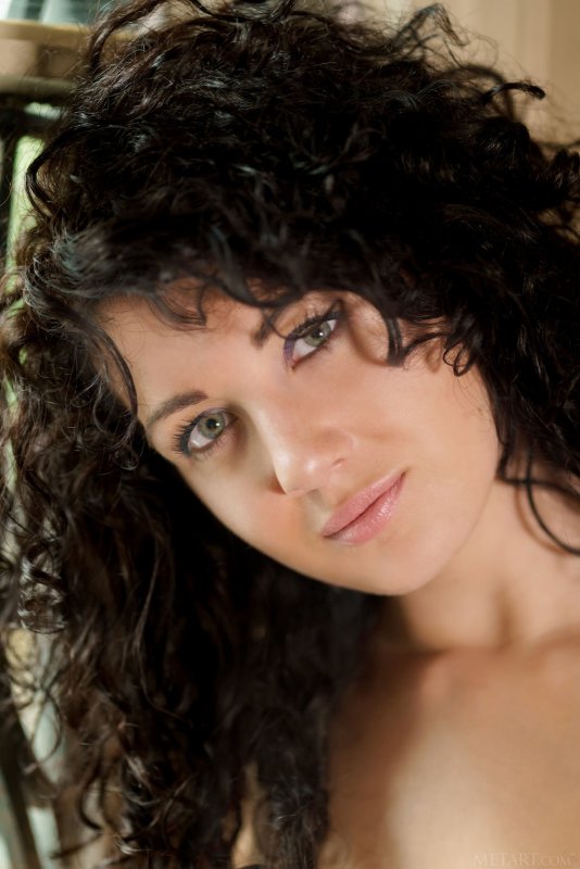 Начав эротично позировать дома, кудрявая девица в корсете и трусиках старалась грациозно поднимать руки вверх и сексуально раздвигать длинные ноги сидя на стуле, параллельно раздеваясь догола. В обнаженном виде стройная девушка подробно засвечивает бритую письку и маленькие сиськи.