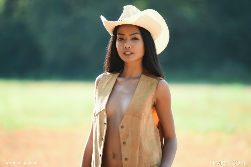 Скинув с себя короткие шорты и жилетку, худая юная тайка в ковбойской шляпе отправляется гулять на улице и голая наслаждается столь волнующим её действием. Оказавшись перед камерой сексуальная девушка с плоской грудью часто присаживалась на корточки и прогибалась раком, что позволяет крупным планом рассмотреть её бритую письку и тощую задницу.