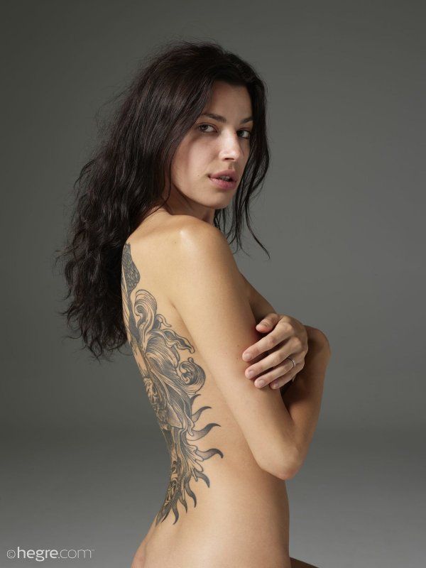 Обаятельная и полностью голая красивая украинка с длинными локонами и татуировкой на спине грациозно позирует и нежно обхватывает маленькие сиськи руками. В процессе порой располагаясь на полу, сексуальная стройняшка подробно делала акцент на бритой письке с гладким лобком и попке.