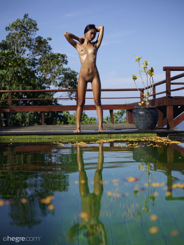Смело позируя у бассейна, порой окуная ножки в воду, сексуальная и полностью голая азиатка с маленькой грудью в процессе съёмки испытывала подлинное удовольствие и медленно возбуждалась. Засвечивая бритую письку, стройная девушка так же прогибала спинку раком, делая акцент на тощей попочке.