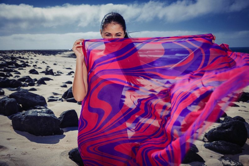 Прикрываясь парео, игривая и полностью обнаженная брюнетка нежится на пляже, присаживаясь на камень и валяясь на песке. Испытывая от своей наготы сильное возбуждение, стройная красавица с большой радостью демонстрировала маленькие сиськи и гладенькую письку с аккуратной попкой, порой поглаживая лицо руками.