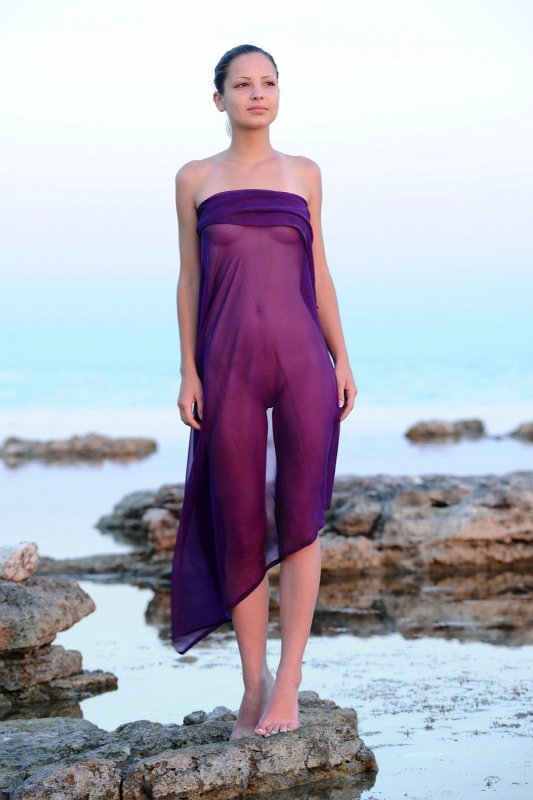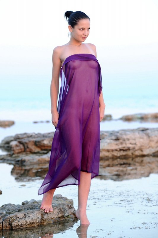 Скинув короткие шортики, обнажённая молодая девица резвится на море перед фотокамерой и с улыбкой на лице показывает себя со всех сторон, порой прикрываясь парео. Таким образом стройная брюнетка продемонстрировала красивые сиськи с бритой писькой, а намочившись повернулась мокрой попкой к фотографу.
