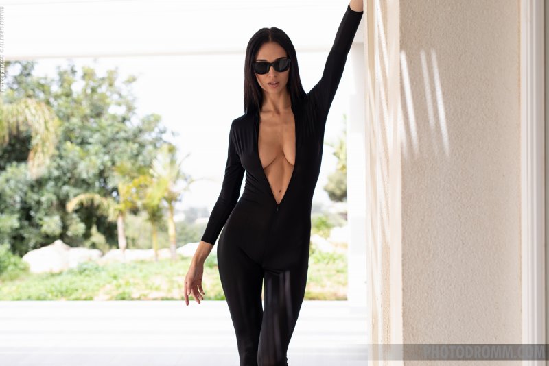 Одетая в облегающий черный костюм, сексуальная штучка с упругими титьками не может долго удерживать свою горячую натуру и снимает с себя мешающийся наряд. Возбужденная красотка со стройным загорелым телом, блестящим от пота, никого не может оставить равнодушным.