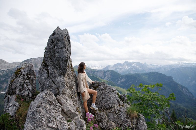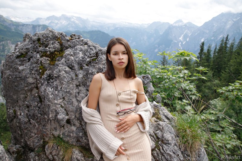 Молодая очкастая девица с маленькими сиськами едет в фуникулере в гору, игриво задирая юбку платья и показывая своим соседям голую бритую промежность. Обнаженная девушка на фоне природы начинает красиво позировать с широко раздвинутыми ногами, засвечивая на камеру гладкую маленькую киску.