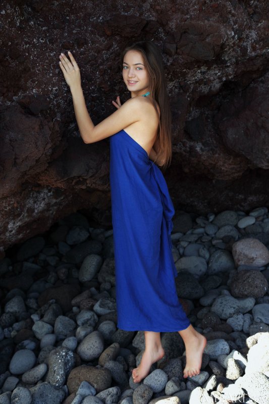 Скинув с себя легкий платок, молодая девушка захотела показать свое стройное нежное тело во всей красе и встала раком в пещере, чувственно выпятив свою упругую сочную попку. Голая красавица, лежа на холодных камнях, широко раздвигает свои длинные ножки, открыто показывая на камеру бритую розовую пизду.
