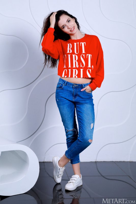 Игриво задрав кофту без лифчика, веселая молодая брюнетка с красивыми упругими сиськами медленно сняла джинсы, оказавшись абсолютно голой перед камерой. Стройная детка с изящным гибким телом без стеснения раздвигает свои ноги и крупным планом показывает бритую промежность с нежной розовой писькой.