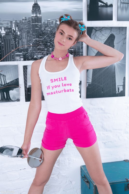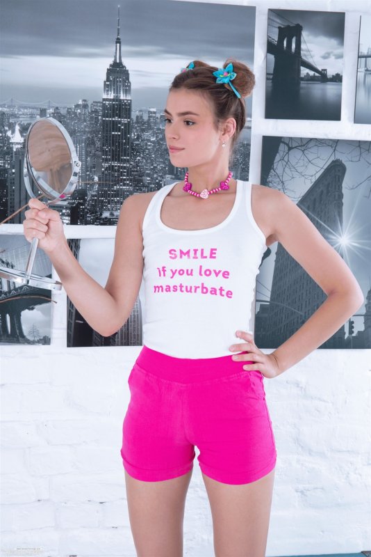 Очаровательная милая детка игриво снимает с себя домашнюю одежду и белые трусики и тщательно рассматривает свою бритую письку в зеркале. В большой кровати молодая девица с маленькими титьками разлеглась с широко раздвинутыми ногами и разводит пальчиками нежные сладкие половые губы, чтобы изучить узкую влажную щелку в отражении.