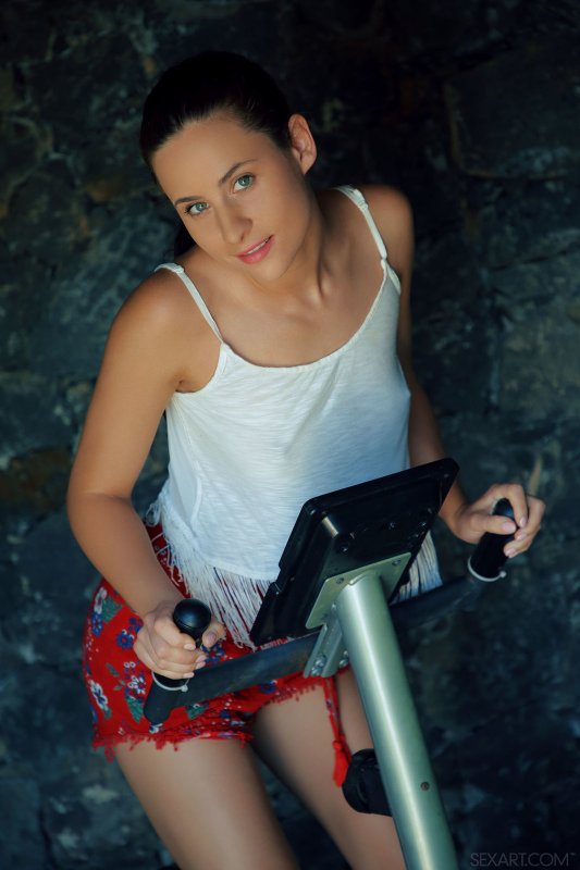 Чтобы поддерживать себя в форме, молодая брюнетка активно занимается на спортивном тренажере, а затем уставшая медленно раздевается до гола. Расслабленно устроившись на стуле, горячая вспотевшая девица раздвигает стройные ножки и крупным планом показывает свою голую гладкую киску с сочными половыми губками.