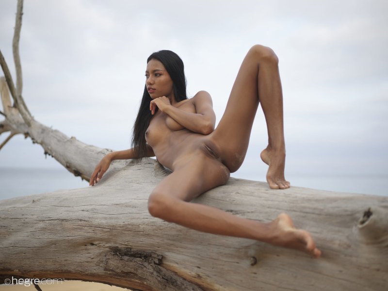 Голая темнокожая азиатка позирует на пляже