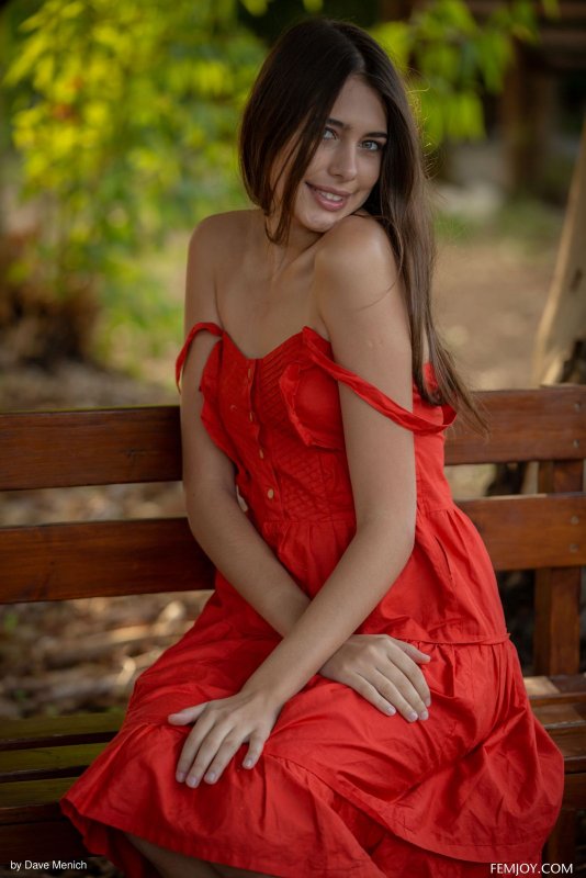 Развратная девушка в красном платье медленно оголила свое стройное молодое тело, соблазнительно скинув с себя всю одежду. Сидя на большой деревянной лавке в парке, бесстыжая девица с маленькими титьками возбуждающе позирует перед камерой, чувственно изгибаясь в разных эротических позах и игриво засвечивая свою бритую нежную киску.