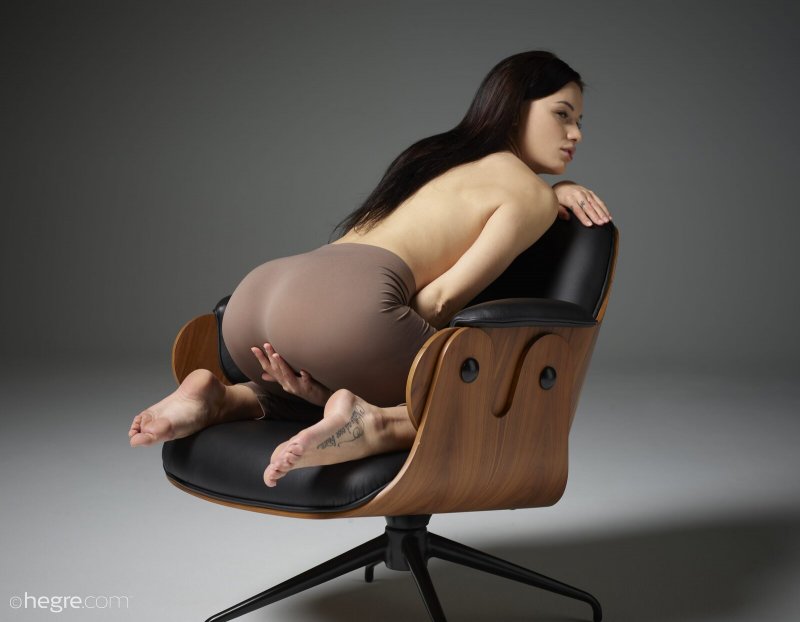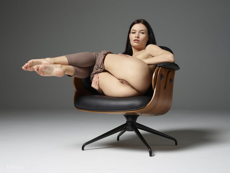 Расслабленно устроившись в большом стуле, развратная брюнетка с голыми плоскими титьками медленно сняла с себя обтягивающие штаны. Выставив на показ свои нежные острые сосочки, обнаженная девица без стеснения раздвинула ноги, а потом соблазнительно выпятила голую попку, засветила свою бритую пухлую киску.