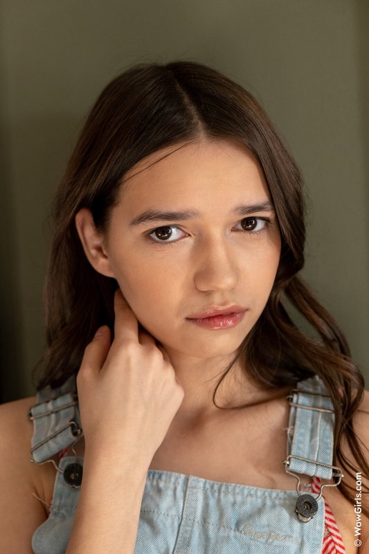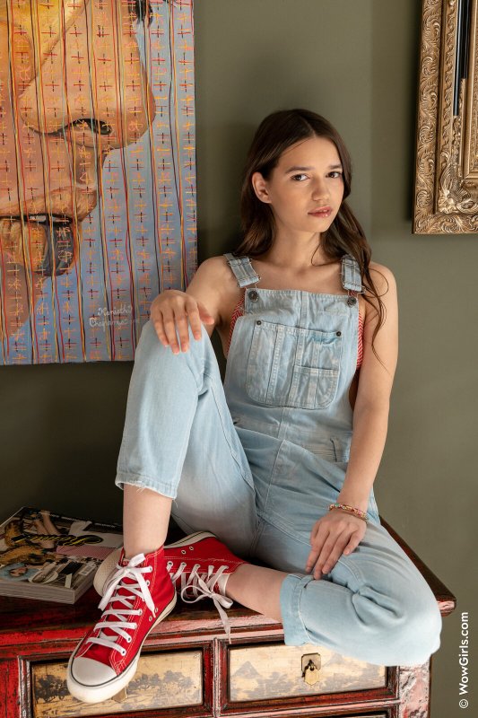 Молодая скромная милашка в джинсовом комбинезоне и кружевном белье медленно разделась до гола, медленно оголяя свое нежное худое тело. Голая детка с маленькими плоскими титьками и коричневыми сосками эротично позирует на полу и с разных ракурсов засвечивает на камеру свою бритую мягкую писю.