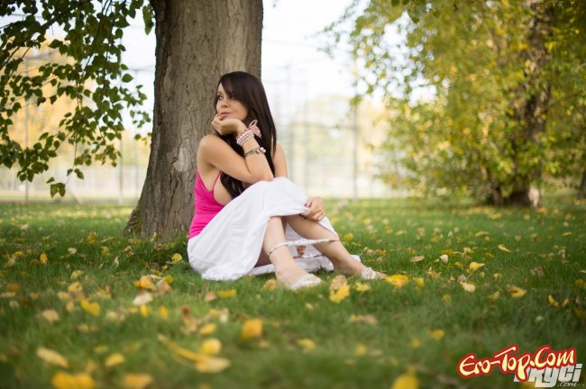 Сексуальная девушка, эротическая модель Bryci пришла в парк, что бы отдохнуть от суеты рабочей недели. Устав ходить пешком, девушка решила присесть отдохнуть под дерево, но вдруг на красавицу нахлынула сильная волна возбуждения и она решила немного по-хулиганить. Она вытащила большую грудь из розового лифчика и сняла белые трусики с яркими цветочками, а мы воспользовавшись моментом, можем заглянуть под её юбку и увидеть бритую киску, с пухленькими половыми губками, которые очень хотят ласки и внимания... Фото очень качественные, большие в высоком разрешении, яркие и естественные, от чего на миг создаётся впечатление присутствия в этом зелёном парке...