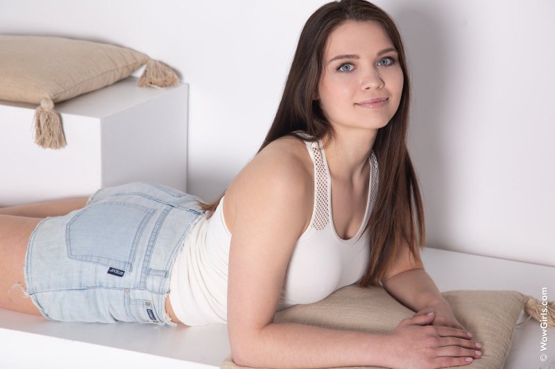 Совершенно не стесняясь фотографа, молодая красивая модель в коротких джинсовых шортиках медленно сняла с себя маечку, выставив на показ упругие натуральные сиськи. Затем, раздевшись до гола, стройная брюнетка с хорошей фигуркой раскрыла перед камерой свою бритую нежную промежность тут же принялась ласкать пальчиками розовую чувствительную киску.