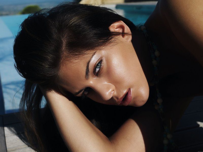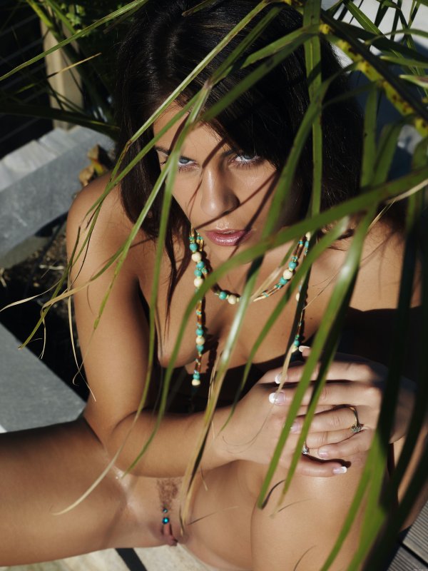 Изнывая от дикой жары, голая загорелая брюнетка томно позирует у большого прохладного бассейна и красиво изгибается всем телом с соблазнительной интимной стрижкой. Развратно расставив в разные стороны стройные красивые ноги, горячая девушка с миниатюрными сиськами с разных ракурсов показывает на камеру свою бритую темную письку с пирсингом в половых губках.