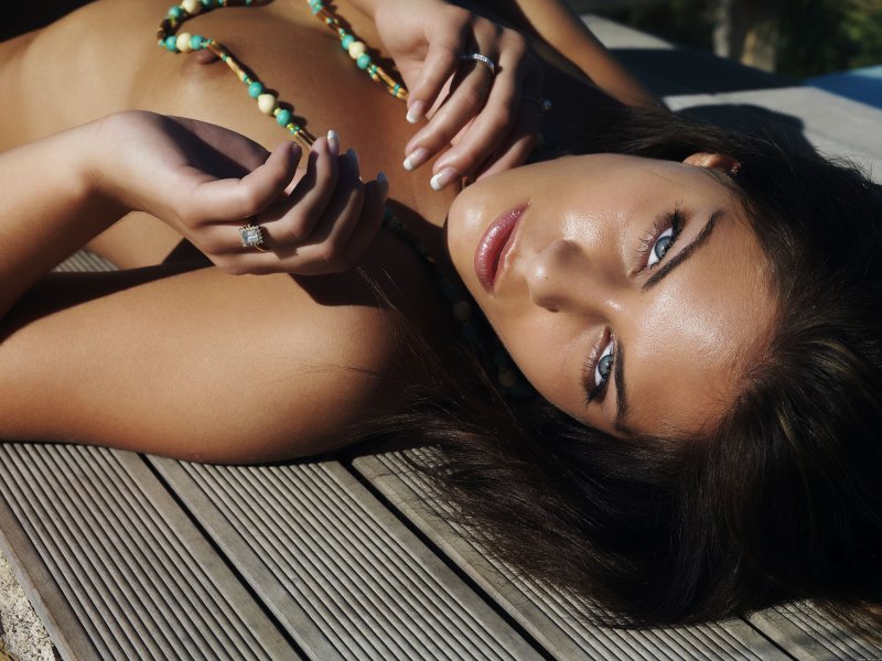 Голая загорелая брюнетка с интимной стрижкой