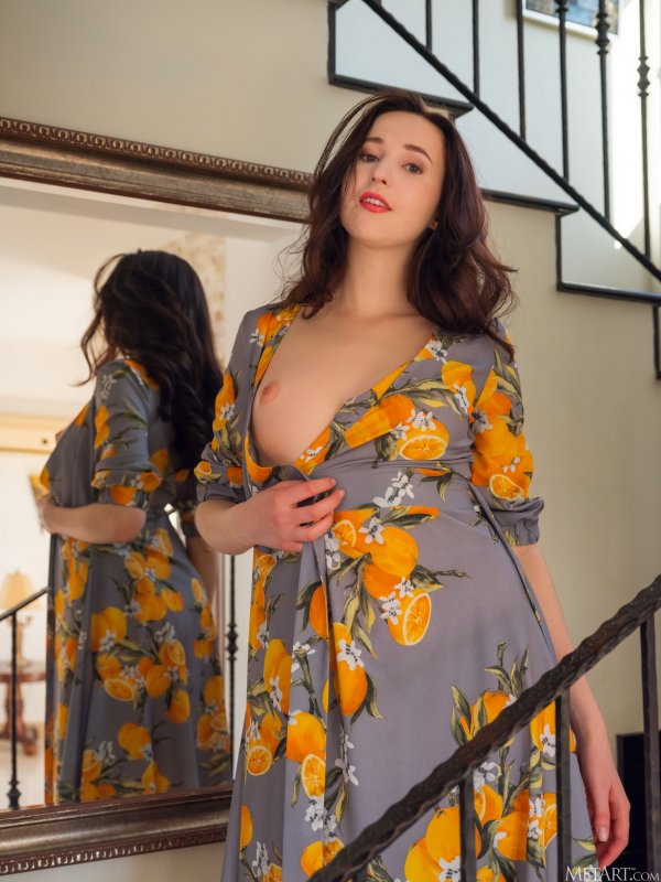 Медленно спускаясь по лестнице и остановившись у большого зеркала, аппетитная телка в распахнутом платье и черных трусах игриво разделась перед камерой до гола и, раскрыв голую бритую промежность крупным планом, во всей красе показала нам свою красивую розовую пиздёнку.