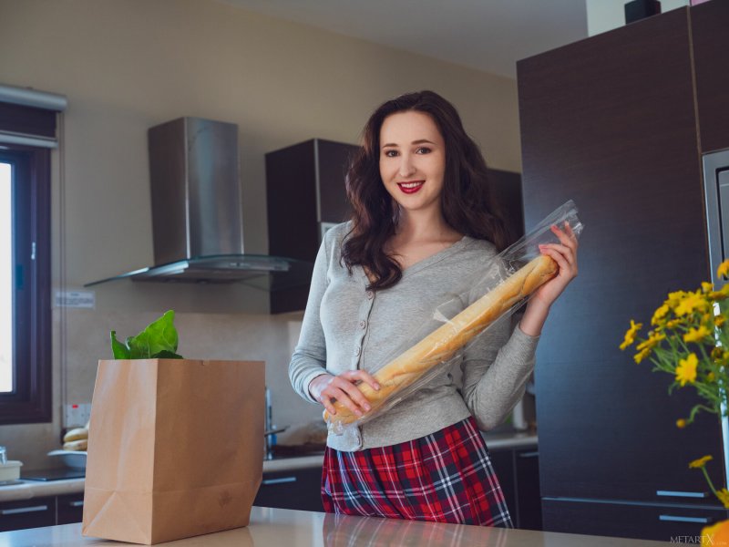 Придя домой из магазина, молоденькая домохозяйка с голыми упругими сиськами возбуждающе медленно разделась до гола на кухне. Игриво забравшись на столешницу и развратно позируя на ней голышом, бесстыжая телка широко раздвигает перед камерой длинные ноги в чулках и крупным планом засвечивает свою бритую сочную пиздёнку.