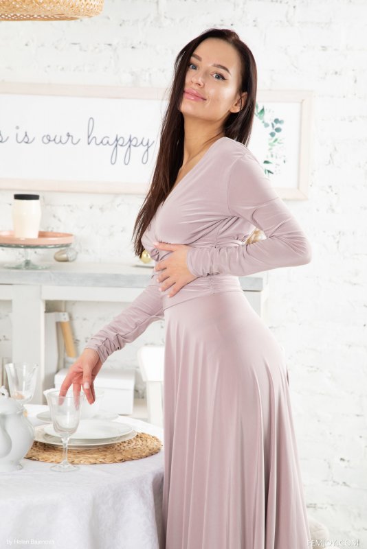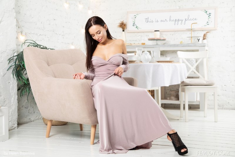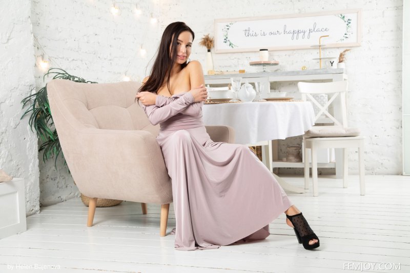 Медленно избавившись от шикарного длинного платья с трусиками, похотливая сучка выставила на показ перед камерой свое сексуальное подтянутое тело и эротично позирует голышом в кресле, выпячивая вперед бесстыже раскрытую промежность с бритой сладкой писькой между ног.