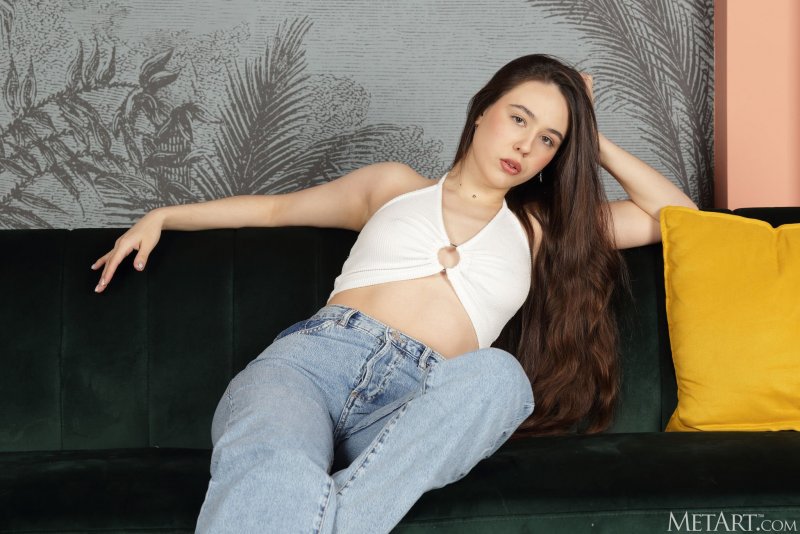 Возбуждающе медленно сняв с себя перед всеми открытый том и обтягивающие джинсы, аппетитная девка наслаждается всеобщим вниманием и развратно трясет своими голыми натуральными сиськами и задницей, интригующе засвечивая между сочными бёдрами бритую пизду.