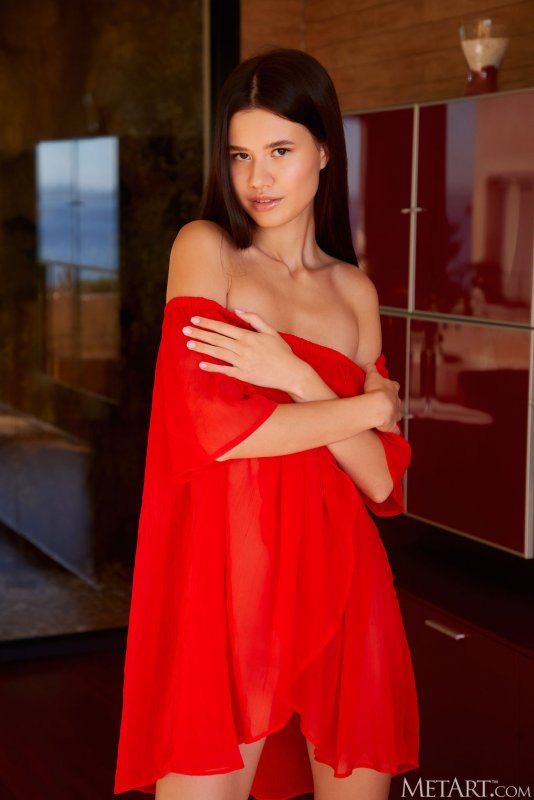 Соблазнительно извиваясь перед камерами всем телом и медленно стягивая с себя красное платье, голая худышка с плоскими титьками позирует прямо на полу и развратно раздвигает длинные стройные ножки как можно шире, демонстрируя нам шикарный вид на бритую темную письку с сочными губками.