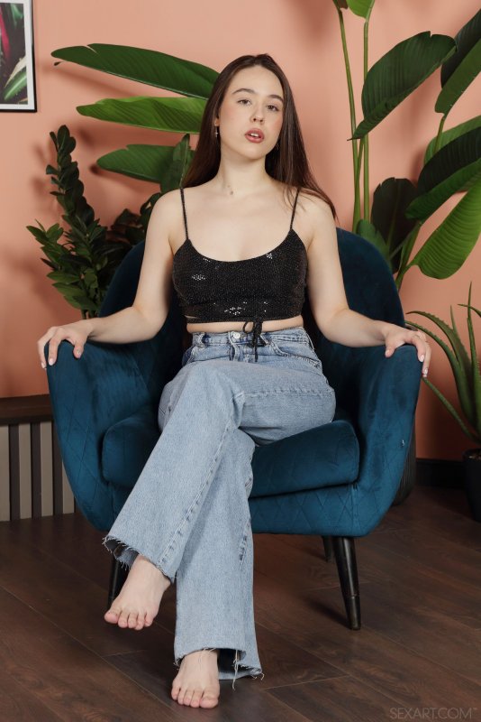 Оголив под майкой свои натуральные тити, аппетитная баба медленно и на показ снимает обтягивающие джинсы с большой сочной попы. Затем голая брюнетка с широко раскрытой рогаткой удобно устраивается на стуле и начинает игриво засовывать пальчики в свою бритую письку с маленькой влажной дыркой.