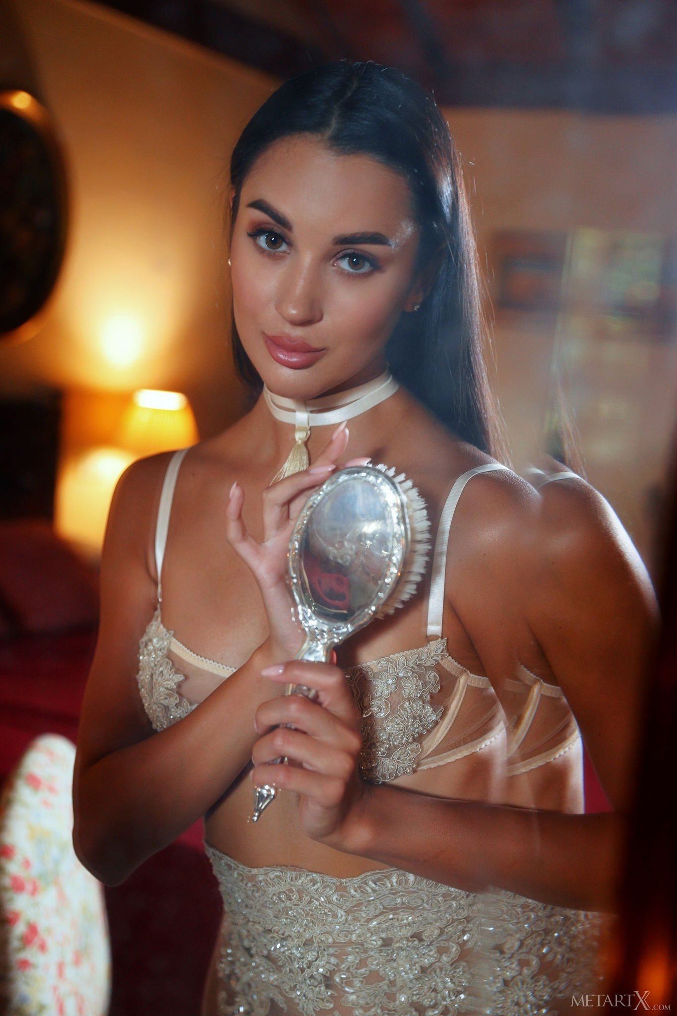 Стоя перед старинным зеркалом, похотливая брюнетка с длинными чёрными волосами в нижнем кружевном белье бежевого цвета, с чокером и подвязками, дразнит нас своей голой киской. Она медленно раздевается, оголяя упругие сиськи и гладкую кожу. Садится на комод, широко раздвигает ноги и пальчиками раздвигает набухшие губки, лаская влажную киску. Шлюшка выгибает спинку на четвереньках на полу, маня круглой попкой и мокрой дырочкой, готовая к жаркому траху в этой винтажной спальне при свете свечей.