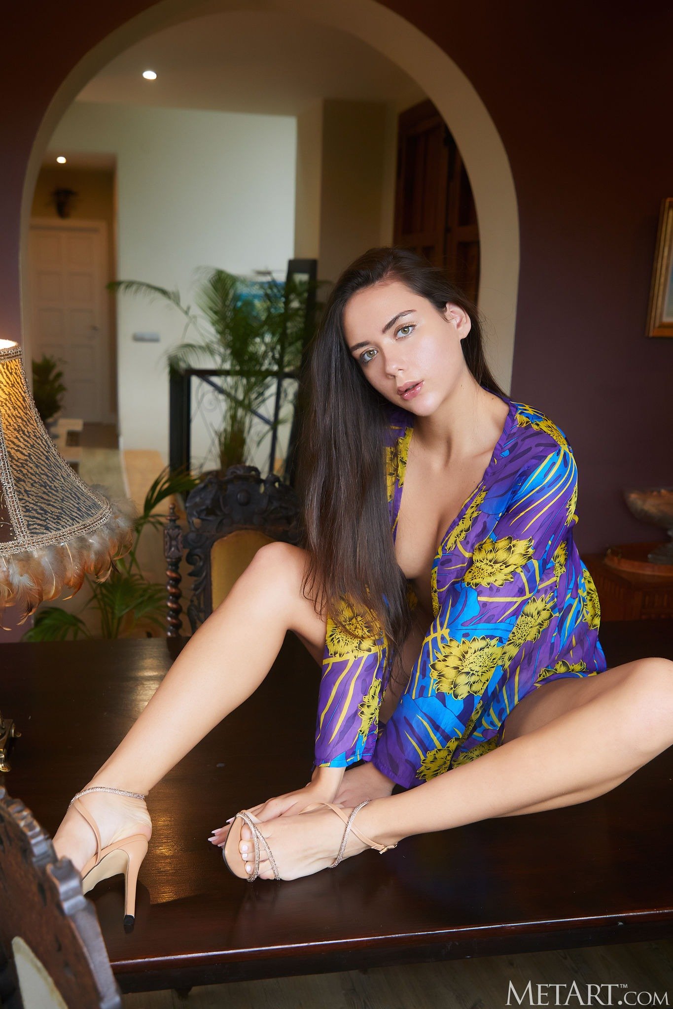 Возбуждающе медленно оголив свое стройное соблазнительное тело от яркой блузки, молодая брюнетка с маленькими сиськами широко раздвигает аппетитные ноги прямо на столе и крупным планом демонстрирует между ними свою бритую письку с торчащими розовыми губками.