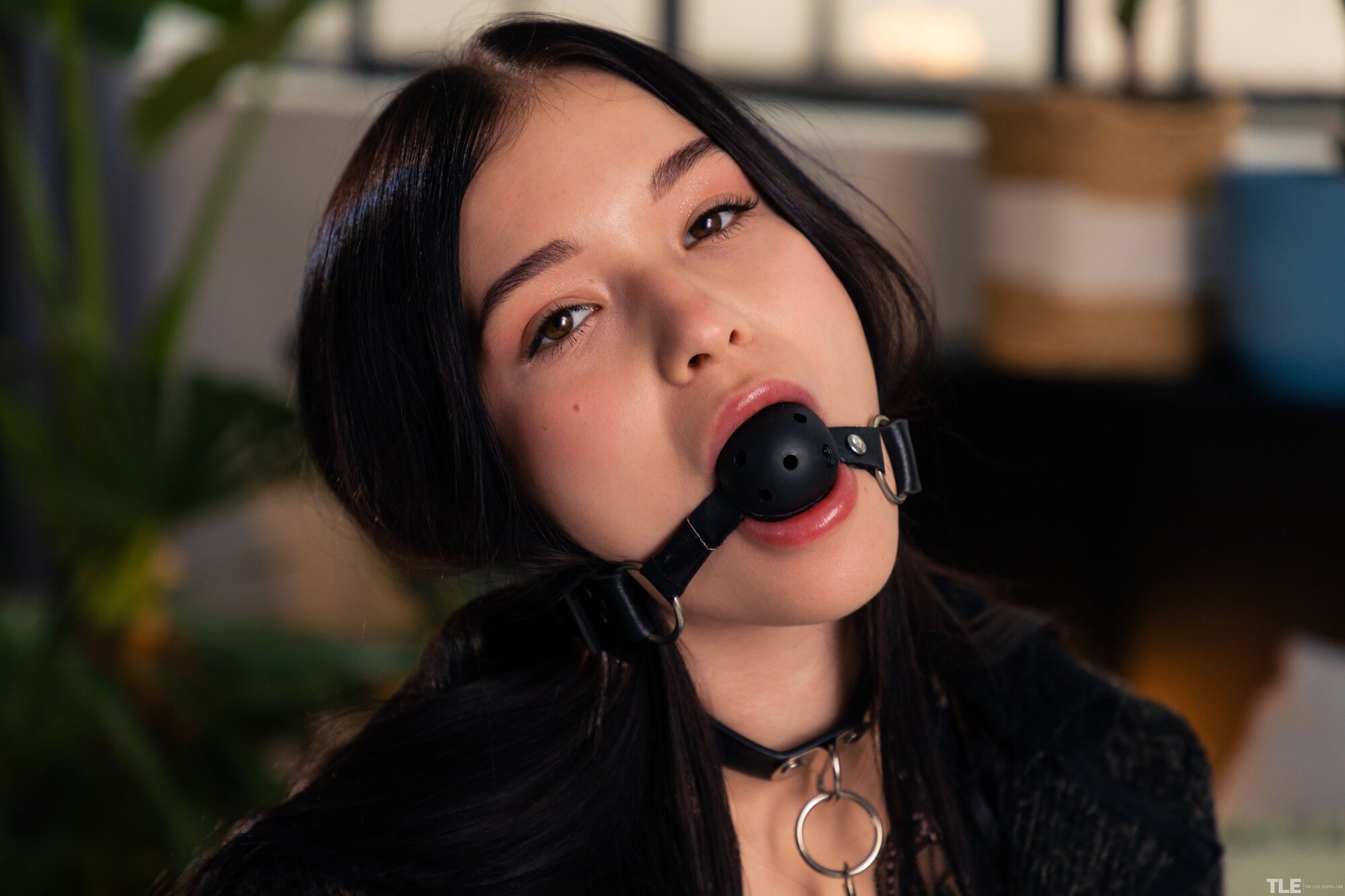 Нимфоманка позирует в ошейнике и с кляпом во рту