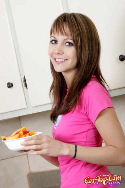 Молодая развратница Andi в яркой футболке и обтягивающей короткой юбке показывает свои прелести перед камерой профессионального фотографа. Раздеваясь в загородном доме с роскошной кухней и кушая фрукты, он представляет нам то, что находится под ее одеждой. Чистенькая и побритая киска очаровательно смотрит на тебя и зазывает к себе, а ее небольшая грудь, просто идеально подчеркивает ее сексуальное строенное тело. Милое личико и славная улыбка вводят небольшой ступор, даже очень опытного самца.