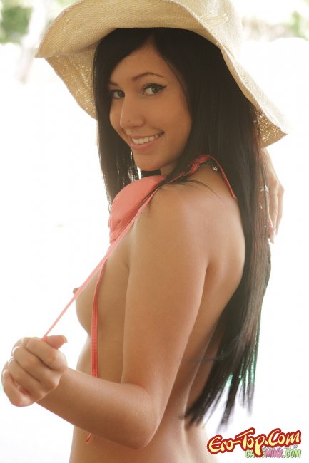 Сексапильная молодая брюнетка в шляпе сидит на стульчике в красном бикини, а через лифчик выглядывают заметные сиськи с упругими сосками. Красиво улыбаясь телочка стягивает с себя трусики оголяя белоснежную большую попочку. Крупным планом можно разглядеть ее очень узенькую анальную дырочку в которой не побывало еще членов, а вот ее розовенькая гладкая киска уже натерпелась.