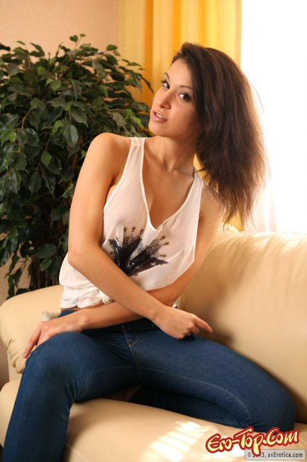 Посмотрев на эту очаровательную красотку на первом фото, можно с первого взгляда понять, что у неё классные большие сиськи. Грудастая в джинсах милашка сидит на диване и соблазнительным взглядом смотрит в камеру. Затем детка задирает футболку и демонстрирует нам ослепительные дойки. После этого, молоденькая сучка снимает штанишки и лежит в одних трусиках в горошек. вскоре и их она снимает и теперь модель предстаёт перед нами совершенно голенькой, демонстрируя свою гладенькую писю.