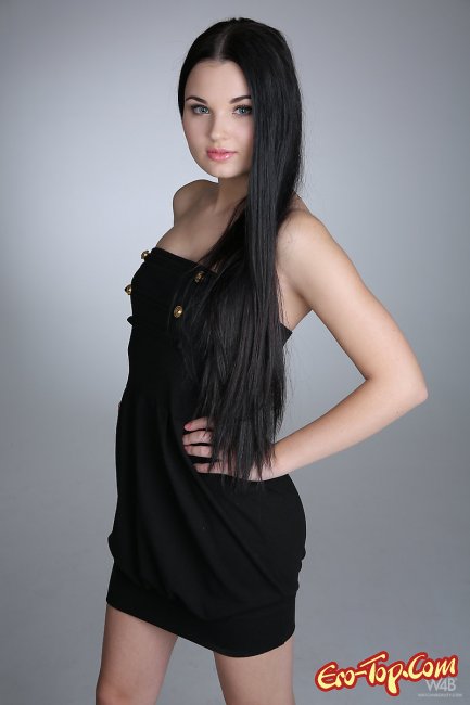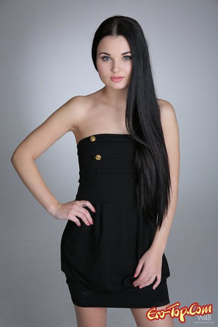 Зеленоглазая красавица с длинными до задницы волосами, эротично позирует в черном платье. Брюнетка медленно его снимает и оголяет сперва упругие груди с твердыми маленькими сосками, а потом полностью обнажается. Восхитительная сучка на высоких каблуках смотрит в камеру и стягивает трусики. Потом куколка начинает показывать свою писю и гладкую мягкую попку крупным планом.