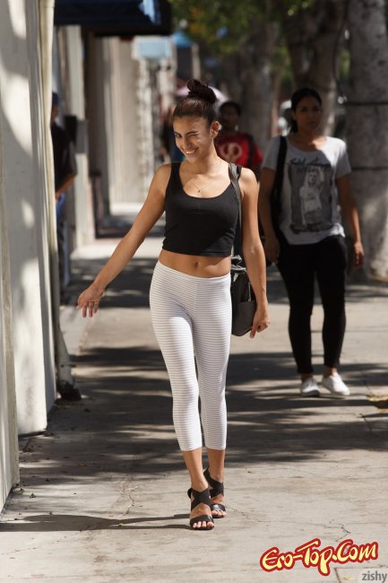Смуглая грудастая девушка снимает майку и обтягивающие лосины, что бы похвастаться своей фигуркой с сексуальными формами.