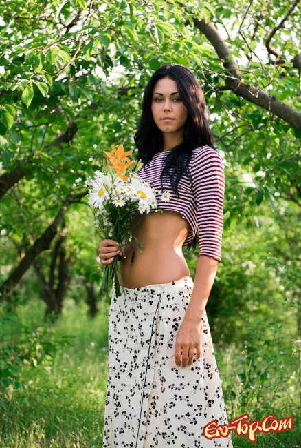 Озорная молоденькая брюнетка с ямочкой на подбородке и большими глазами сексуально прогуливается в лесной чаще. Красотка игриво демонстрирует маленькую, но по-своему красивую грудь с большими ореолами сосков и соблазнительно улыбается. Шаловливая голая девушка на природе не стала останавливаться на обнажении бюста и показала другие не менее интимные места.
