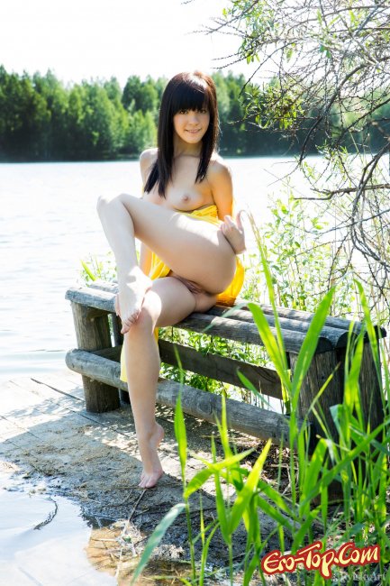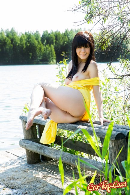 Выйдя на озеро в привлекательном желтом платье девушка решила немного попозировать, стараясь засветить свои прелести. Так как под ним ничего не было, она начала поднимать края и демонстрировать киску. В какой-то момент так же приспустила и верх, показав грудь.