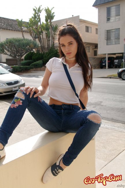 Красивая голубоглазая девушка захотела показать один день из своей жизни. Отправившись в магазин, малышка решила приспустить джинсы, немного показывая попку. Далее ей захотелось продолжения и по этому она поспешила домой, желая оголится полностью, продемонстрировав большую грудь и сексуальную киску.