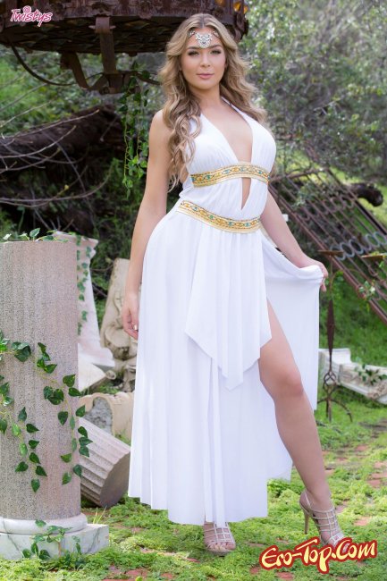 Прекрасный косплей голой девушки на древнюю богиню. Согласно мифологии все богини были самыми красивыми, именно поэтому она идеально подходит на эту роль, так как малышка имеет обворожительную внешность. Надев чудное белое платье, она направилась к декорациям и начала позировать, и показывать, как она умеет хвастать прелестями на камеру.
