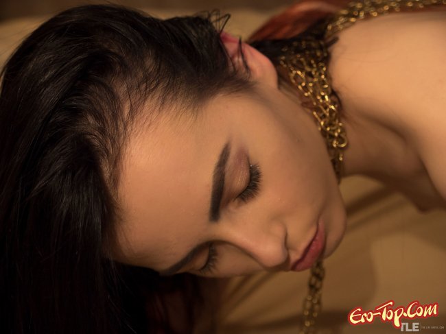 Привлекательная девушка полностью оголившись вооружилась длинной цепью и принялась накидывать ее на себя, принимая разнообразные эротичные позы в постели. В процессе красотке удается продемонстрировать маленькую грудь с гладко выбритой киской и упругую попку.