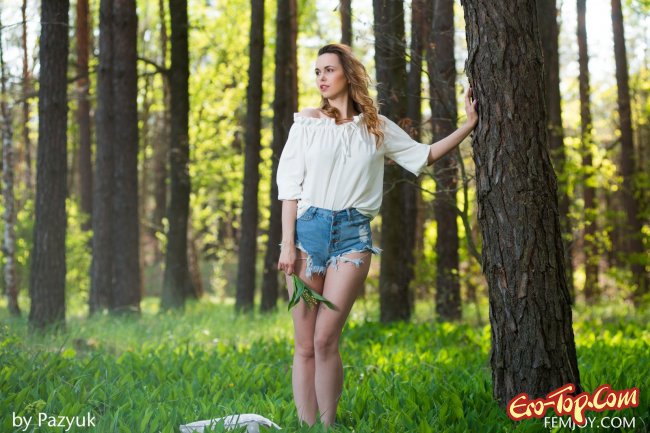 Красивая девушка в белой блузке и джинсовых шортиках, придя в лес, начала эротично позировать, медленно оголяя натуральную грудь. В процессе она и вовсе полностью оголилась и расположившись на траве, принялась засвечивать упругую попку с бритой киской.