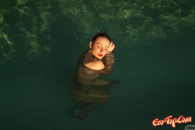 Полностью голая девушка, с накрашенными красной помадой губками, забралась в бассейн и начала эротично купаться, стараясь засвечивать сексуальные части тела перед нацеленной на неё фотокамерой. Плавая на спине, молодая красотка демонстрирует маленькие сиськи, а немного выбираясь из воды ей удается показать упругую мокрую попку.