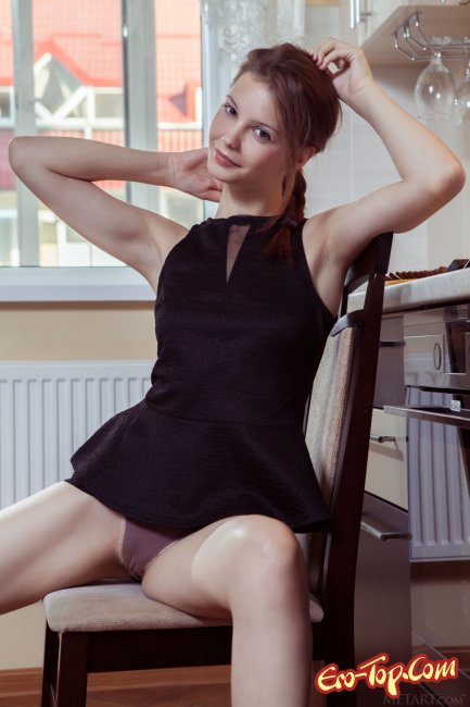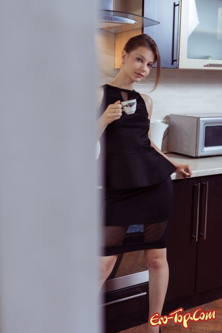 Милая девушка со стройной фигурой, попивая кофе на кухне, в какой-то момент принялась эротично стягивать черное платье с привлекательными трусиками. В процессе красавица демонстрировала маленькие сиськи с набрякшими сосочками, а раздвигая промежность, сидя на стульчике, показала бритую письку.