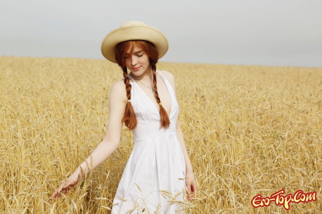 Симпатичная рыжая девушка с двумя милыми косичками, отправилась на пикник в поле, там она стягивает лёгкое летнее платье платье и эротично позирует перед фотокамерой, встаёт раком и демонстрирует шикарную попку. Мило улыбаясь и принимая самые возбуждающие позы, молодая красотка осмелилась показать нам упругую задницу с гладкой кожей, маленькие сиськи и возбуждающую бритую киску с волосатым лобком.