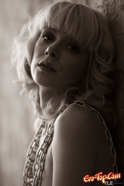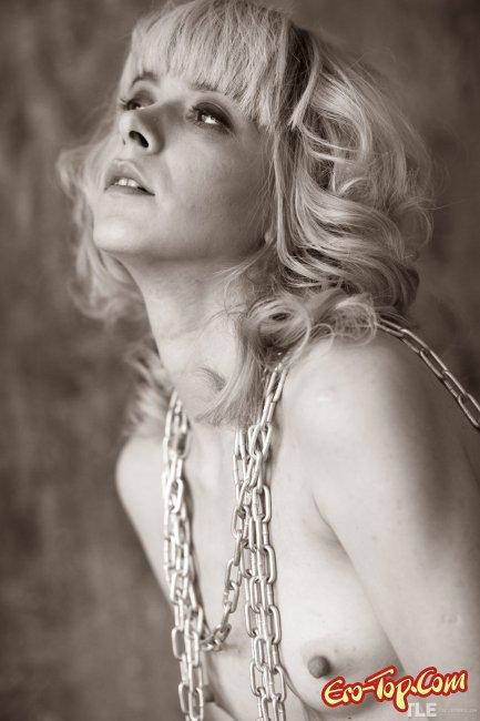 Молодая сексуальная девушка с маленькой грудью решила устроить нежную и возбуждающую фото сессию в чб тонах, для этого она полностью оголилась и обмоталась цепями, придавая пикантности и художественности своим снимкам. Желая показать нечто необычное, блондинка забралась на тумбочку и опираясь на стену взялась страстно раздвигать ножки, прикрывая бритую письку руками.