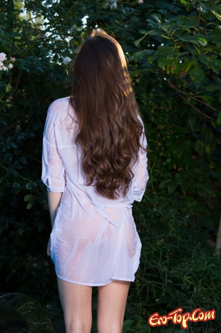 Обворожительная шатенка с достаточно шикарной грудью крупных размеров, устроившись у бассейном, взялась эротично обнажаться и стягивать купальник с белой рубашкой. Полностью раздевшись, красавица с сексуальным телом старается чередовать позиции, что позволило засветить гладенькую киску с плоским животиком и конечно же боле подробно показать сиськи.