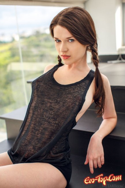 Устроившись на ступеньках лестницы, молоденькая красавица с завязанными в косички волосами, принялась медленно и максимально эротично раздеваться, снимая черную майку и трусики. В процессе возбуждающая крошка чередовала разные позы, в которых можно было подробнее продемонстрировать натуральные сиськи и попку с гладенькой щелкой.