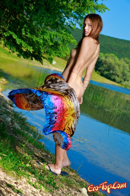 Решив попозировать, сексапильная модель со стройной фигурой и гладенькой кожей, предварительно полностью раздевшись, начала эротично позировать рядом с озером, в процессе прикрывая только красочным платком. Грациозно подымая руки, шатенка поворачивалась упругой попочкой, а так же маленькими сиськами и бритой писькой.